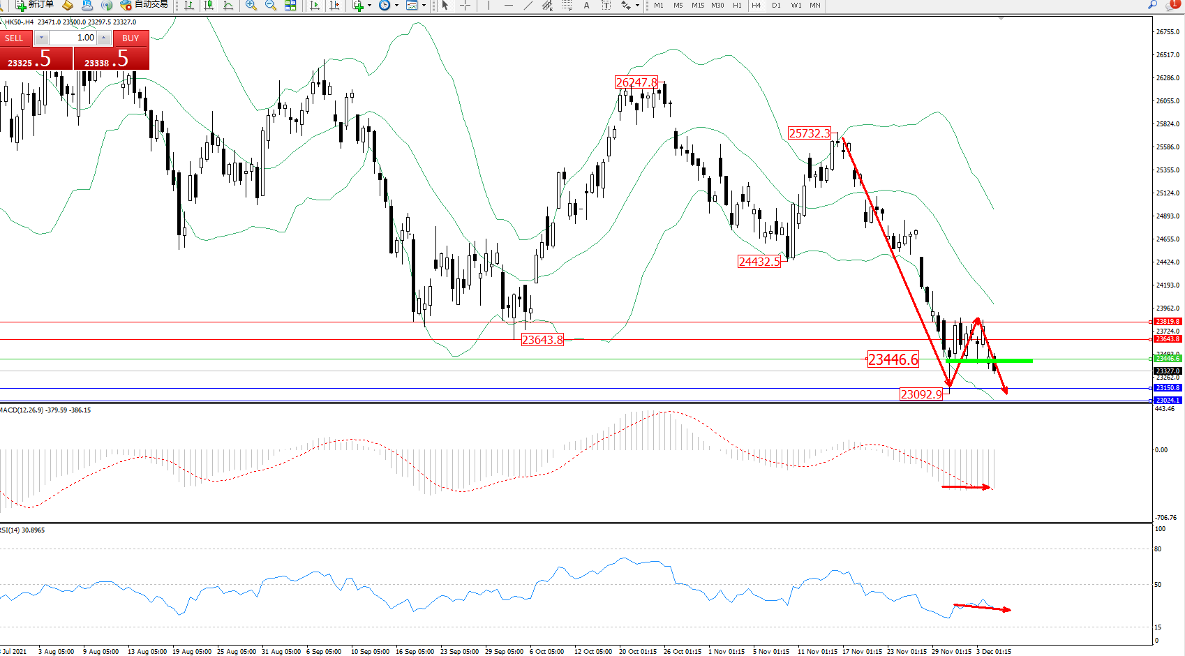恒指HK50 ——4小时K线图显示: