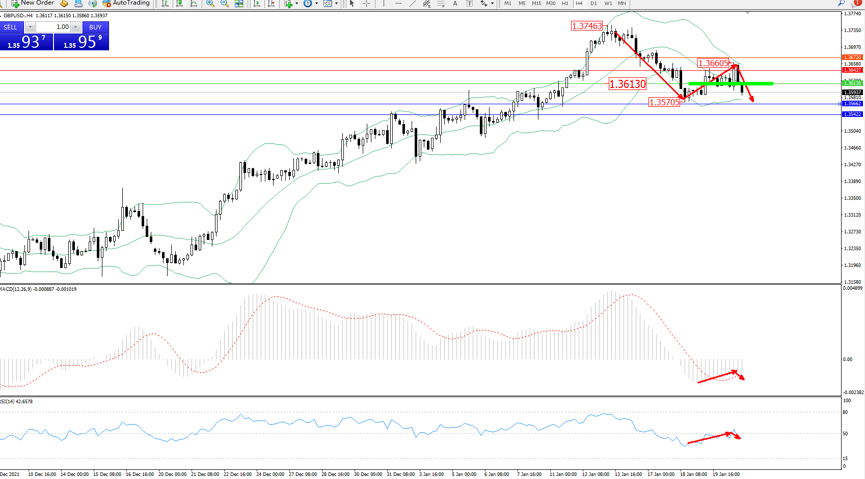 交易策略:1.36130下方看跌,目标1.35662、1.35422
