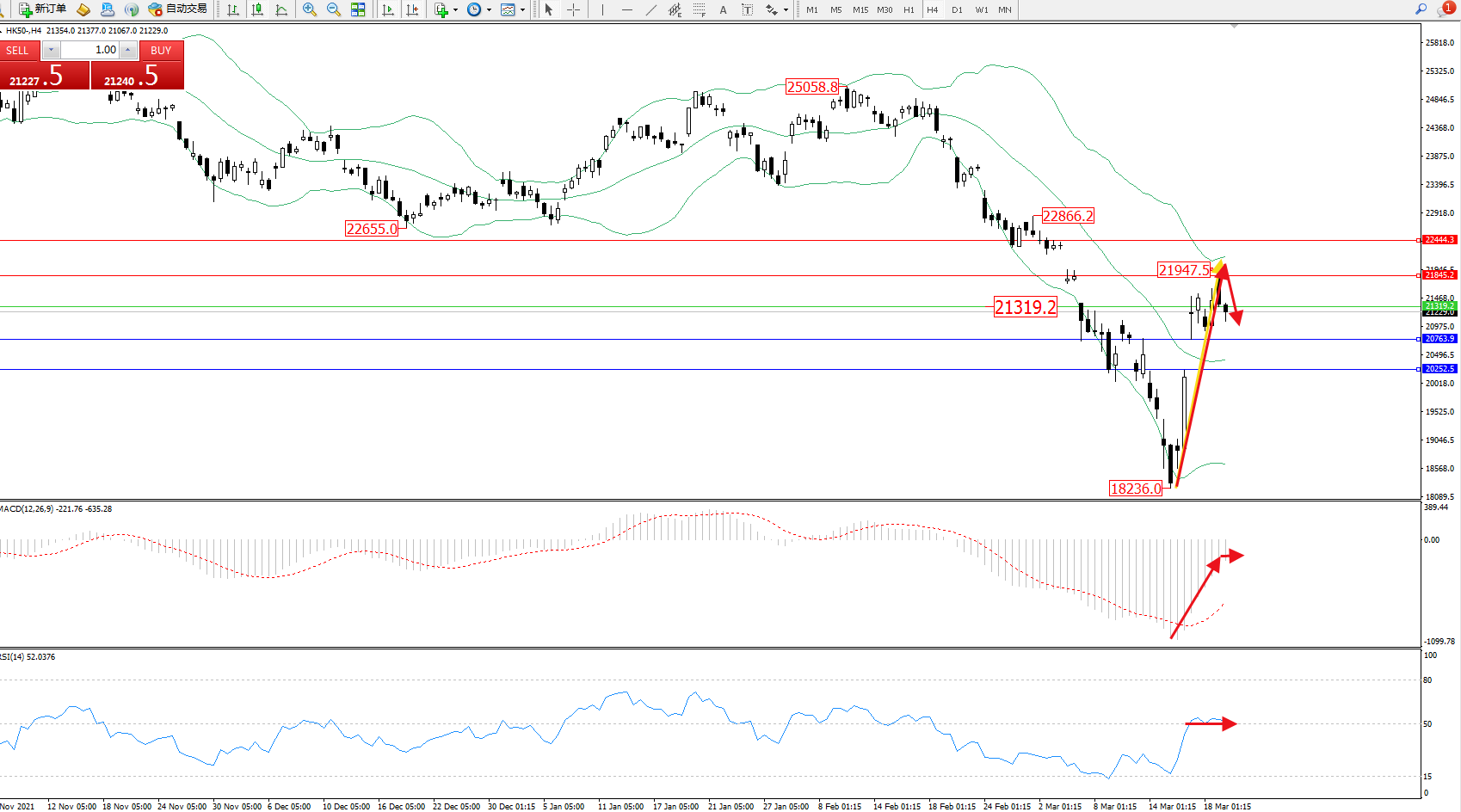 恒指HK50 ——4小时K线图显示: