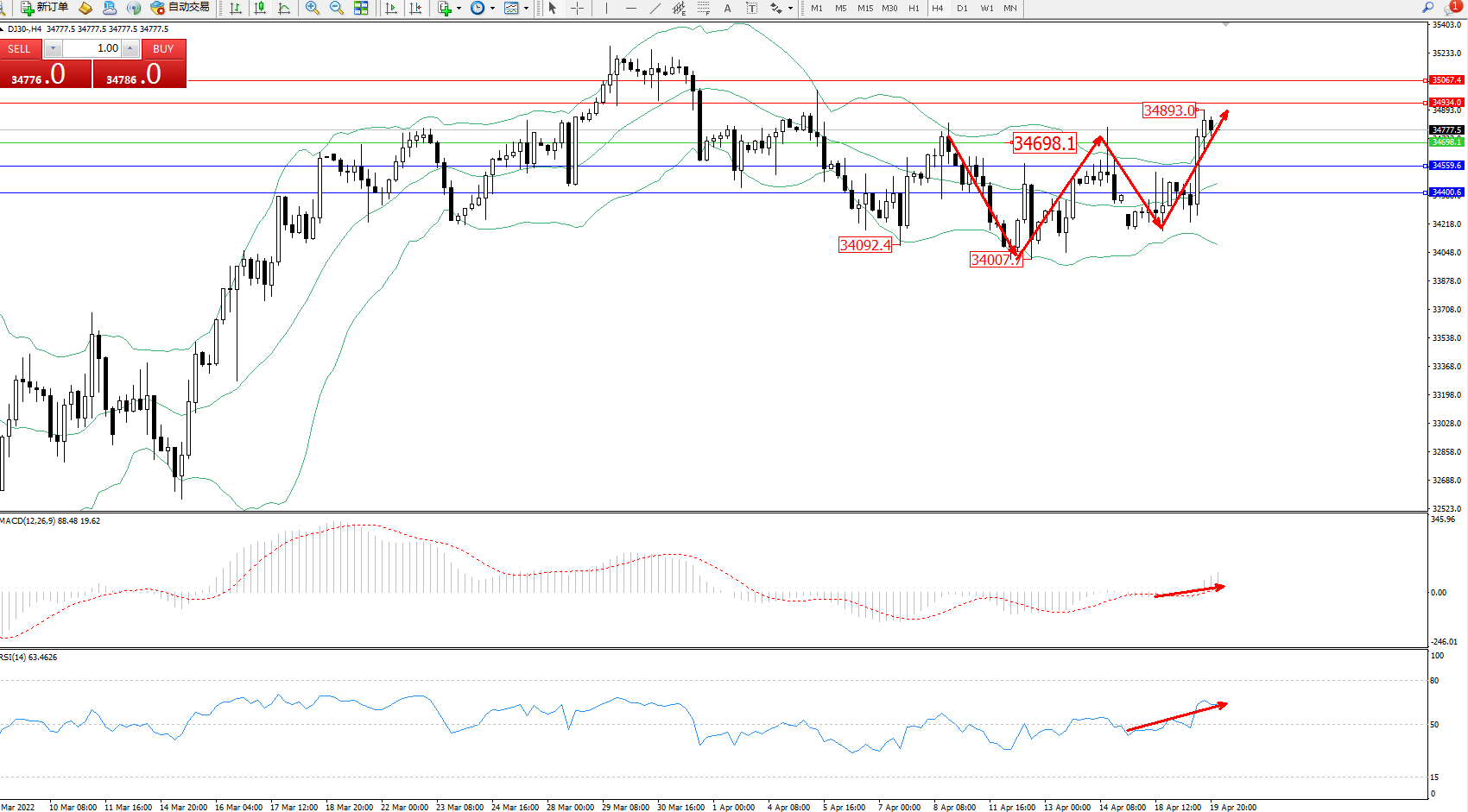技术点评:短期维持在布林带指标通道内宽幅震荡后,波幅空间逐渐收窄,低位多头动力强势拉升上扬至34893附近节点后整理,多头动力有继续攀升态势,布林带指标呈张口走势持续中,MACD指标处于0轴线上方弱势徘徊上移,RSI指标处于多头区域强势上扬中;