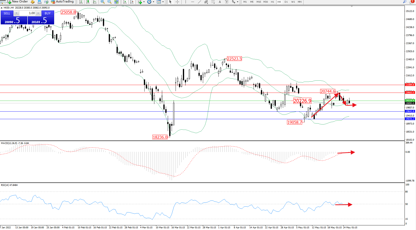 恒指HK50 ——4小时K线图显示: