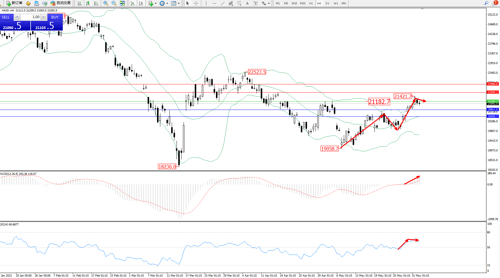 恒指HK50 ——4小时K线图显示: