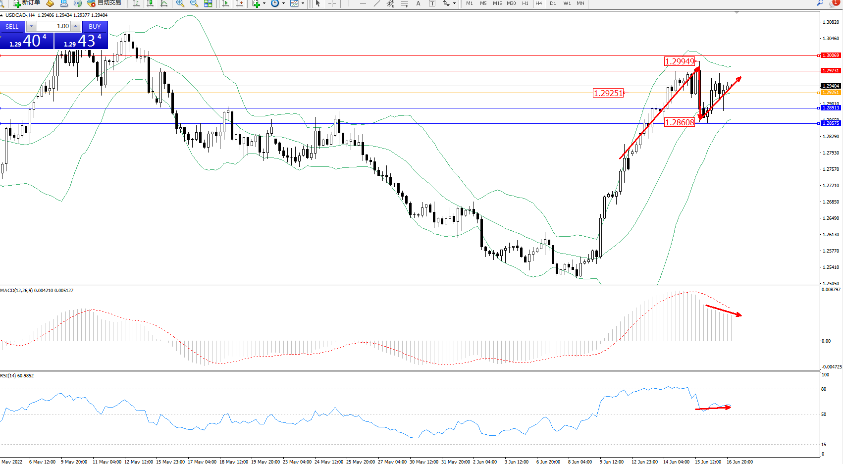 美元加元USDCAD——4小时K线图显示: