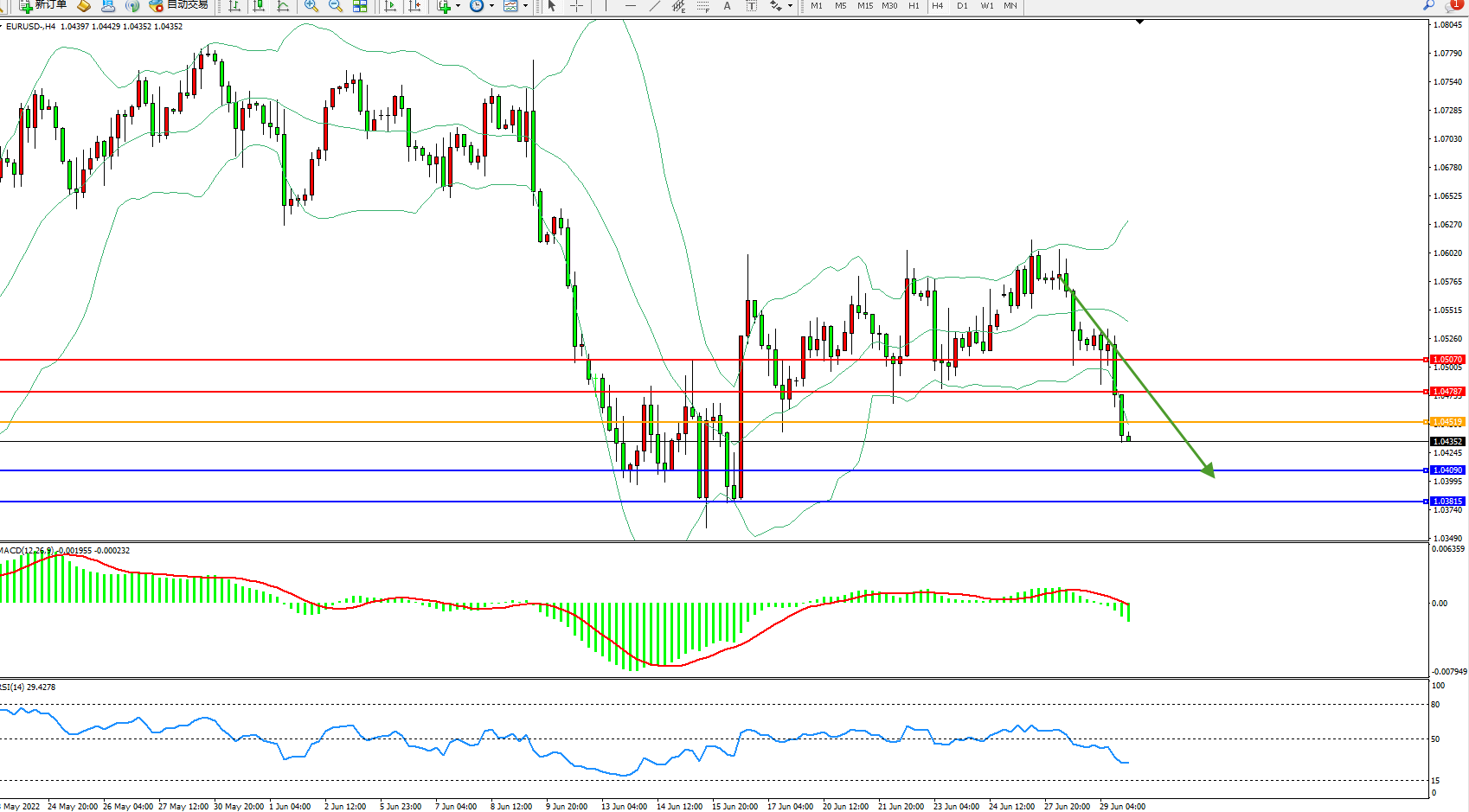 欧元美元EURUSD—4小时K线图显示: