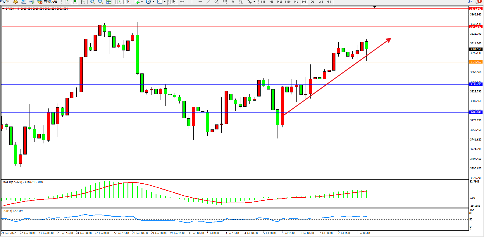 标普SP500——4小时K线图显示: