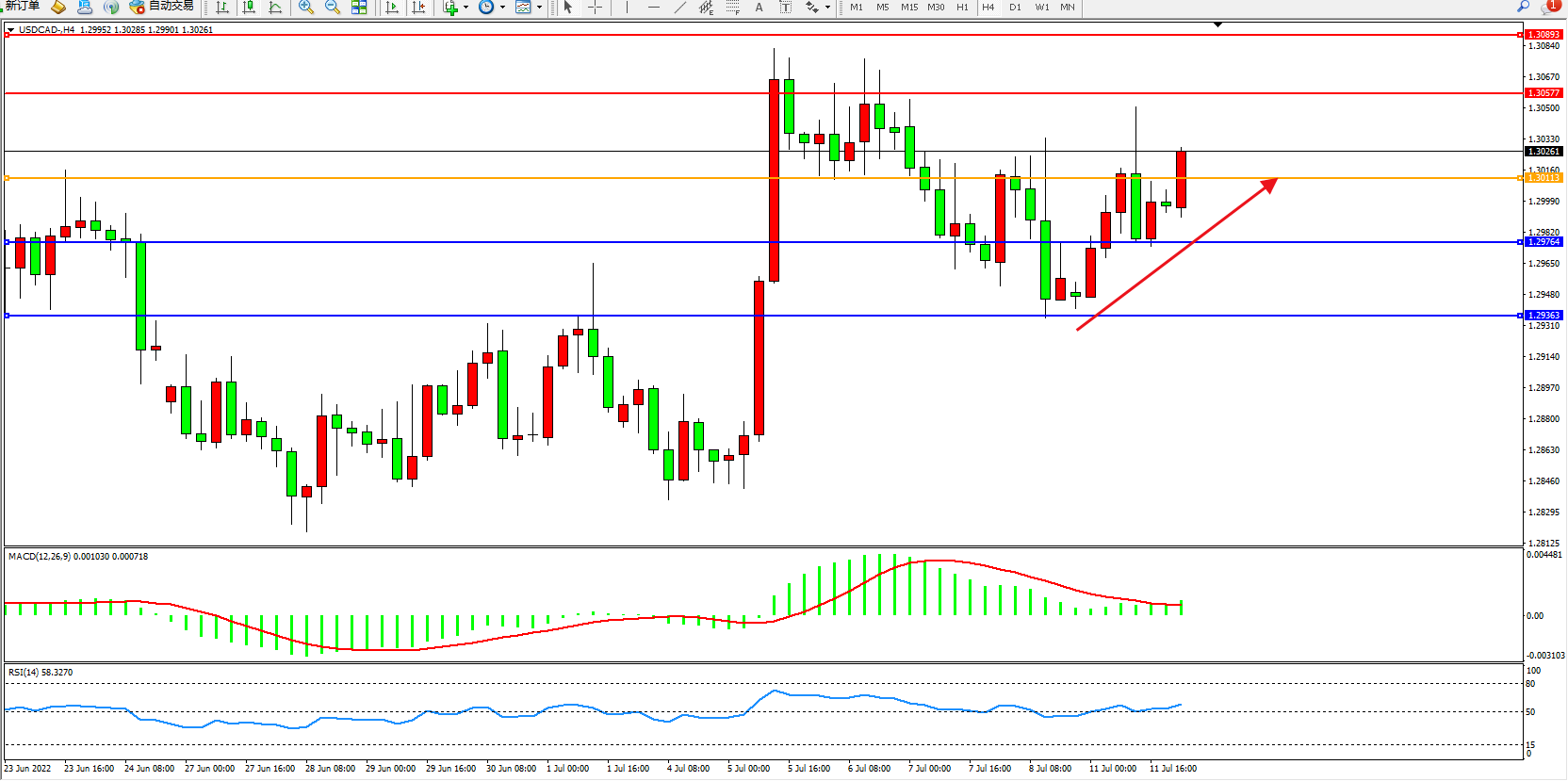 美元加元USDCAD——4小时K线图显示: