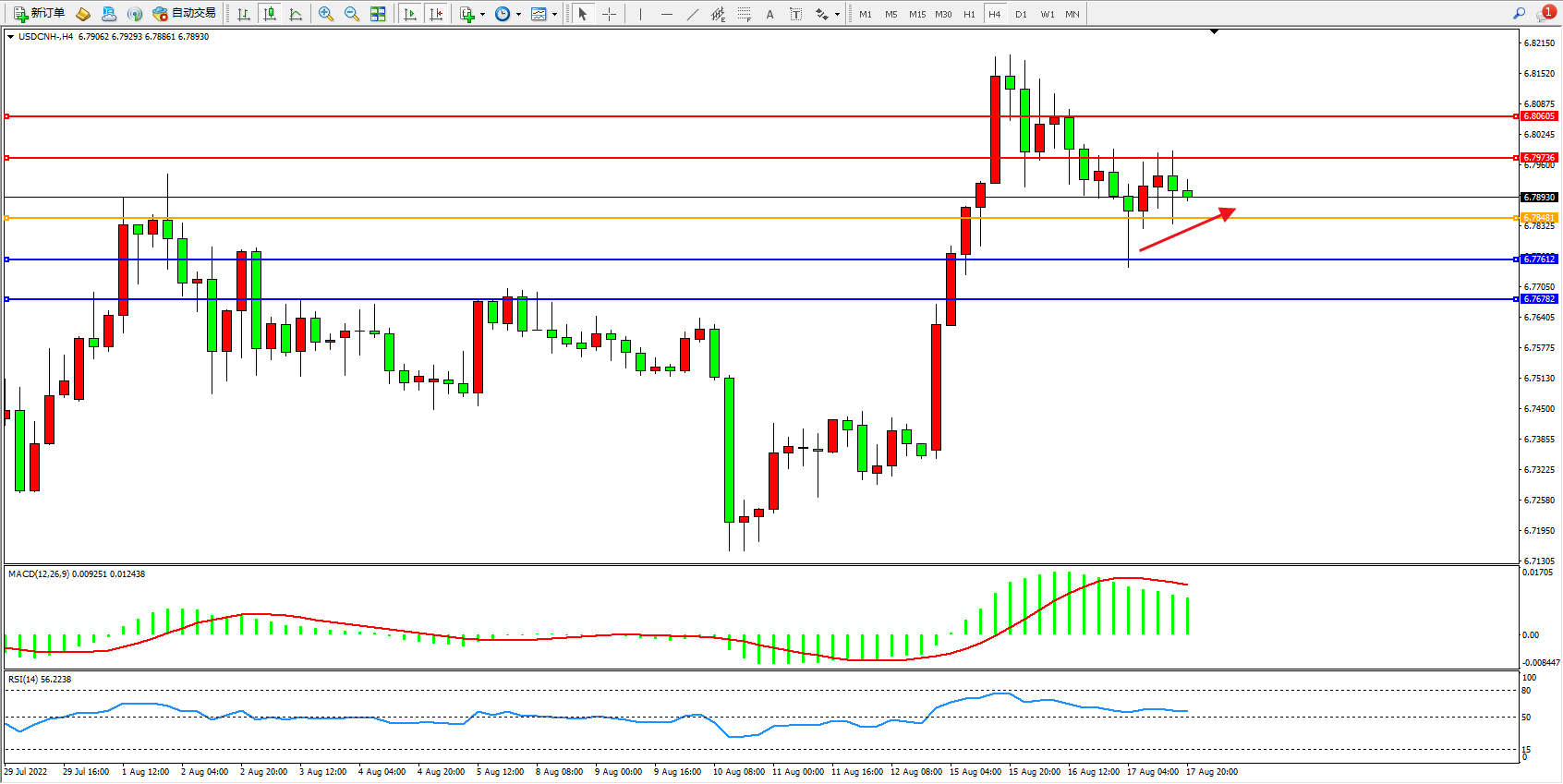 交易策略:6.78481上方看涨,目标6.79736、6.80605