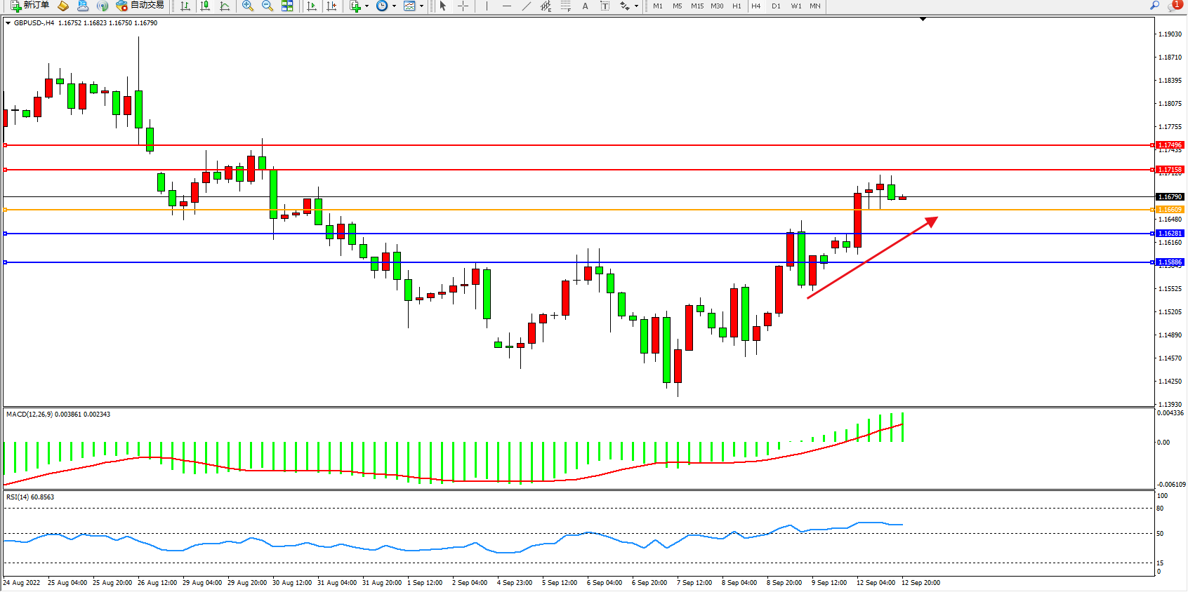 交易策略:1.16609上方看涨,目标1.17158、1.17496