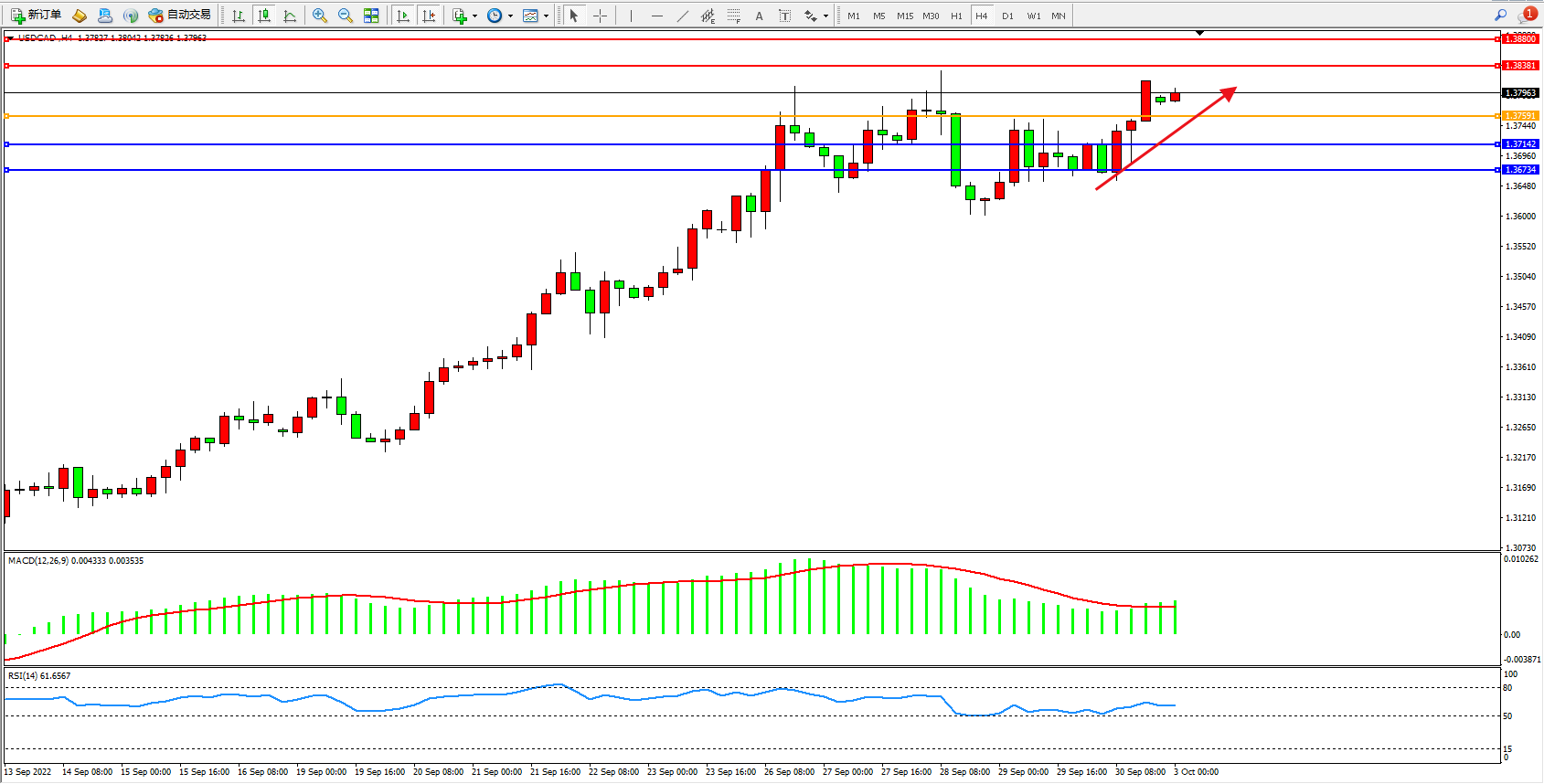 美元加元USDCAD——4小时K线图显示: