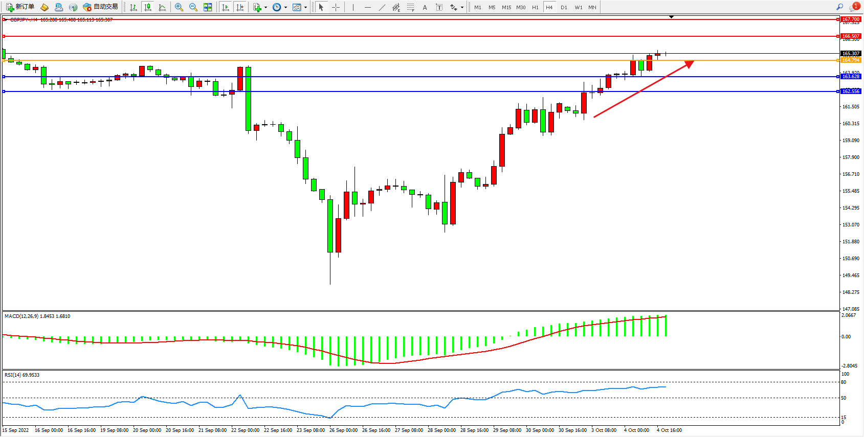 交易策略:164.794上方看涨,目标166.507、167.700
