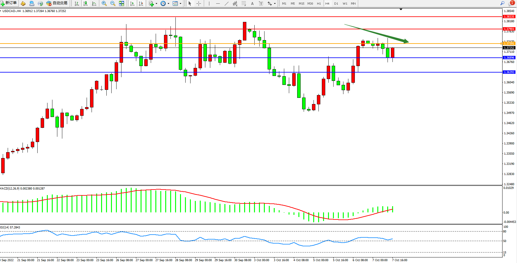 4小时图看:低位多头动力维持震荡上扬,短期高位窄幅整理,市场多头拉升动力减弱,空头入场,MACD指标处于0轴线上側徘徊,RSI指标处于50均衡线上側弱势整理;