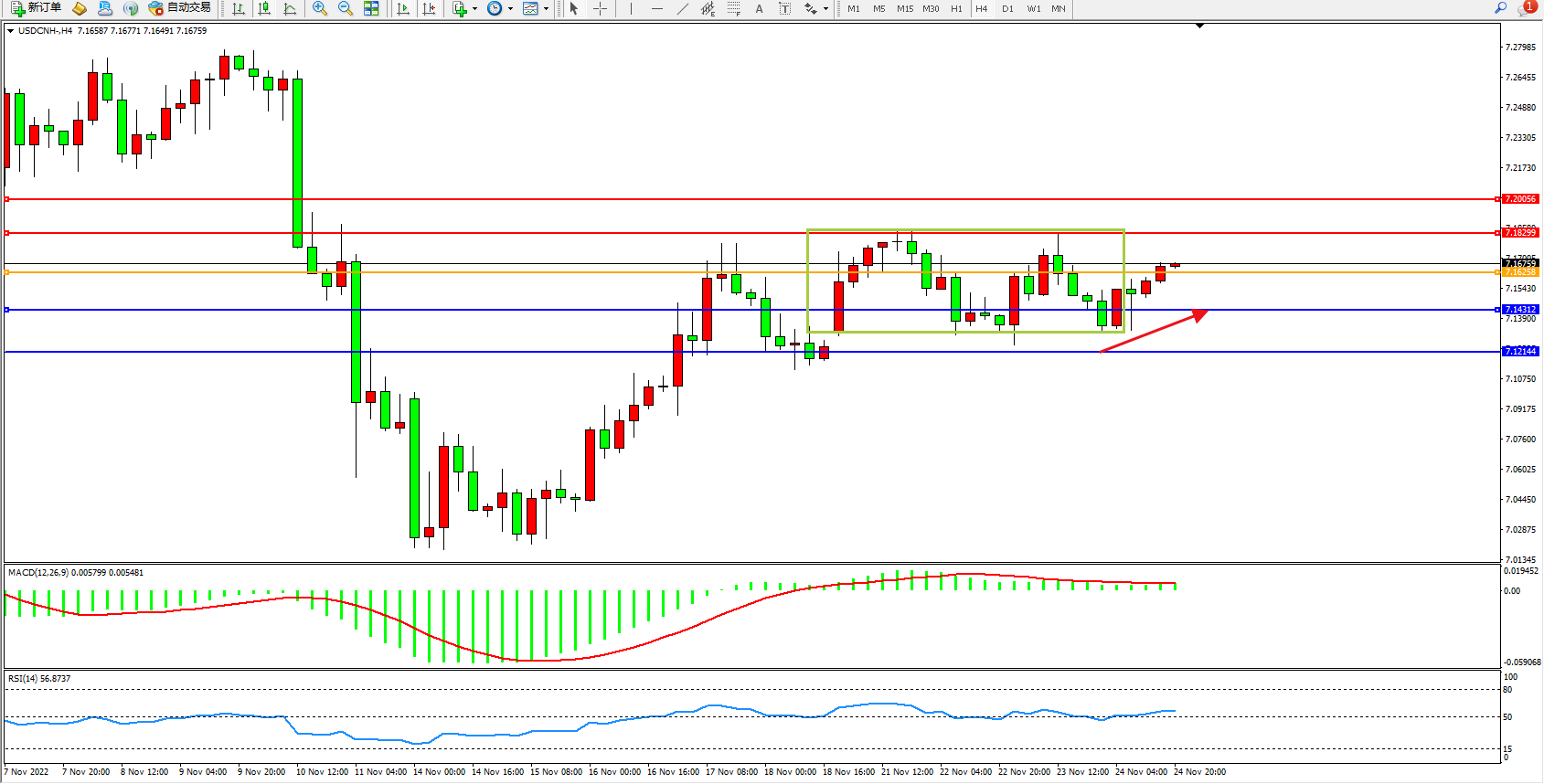 交易策略:7.16258上方看涨,目标7.18299、7.20056