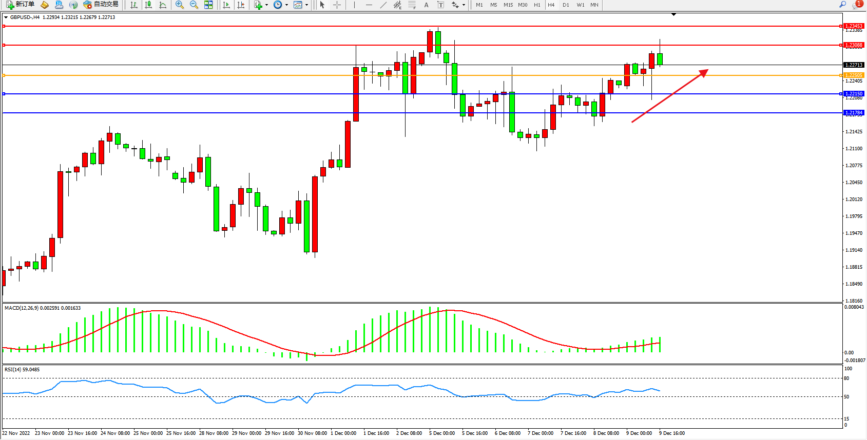 交易策略:1.22505上方看涨,目标1.23088、1.23453