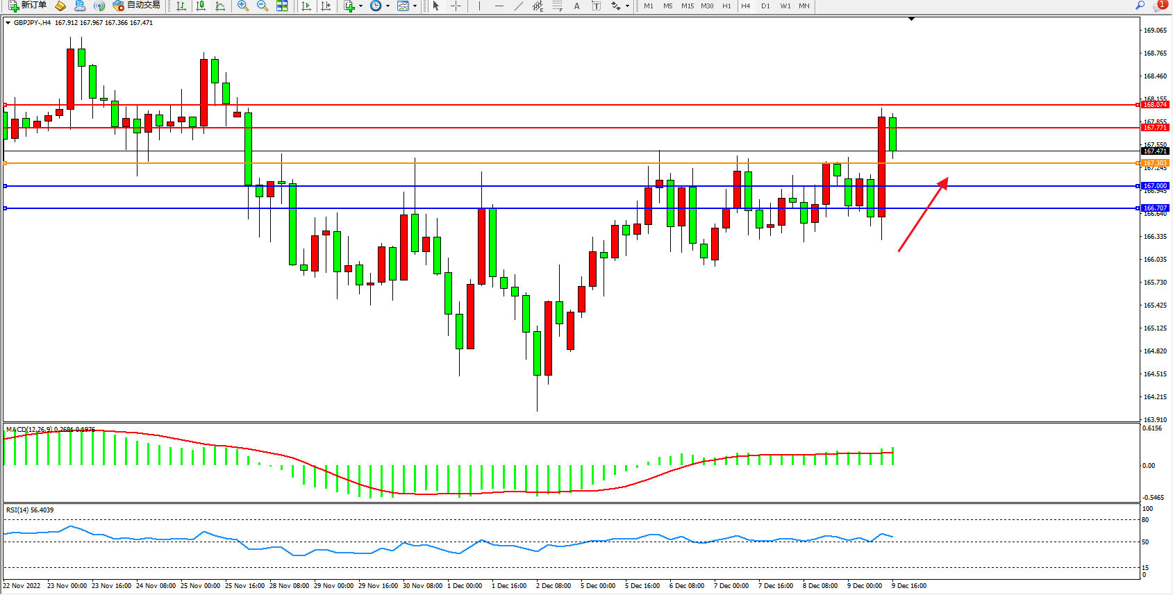 交易策略:167.303上方看涨,目标167.771、168.074