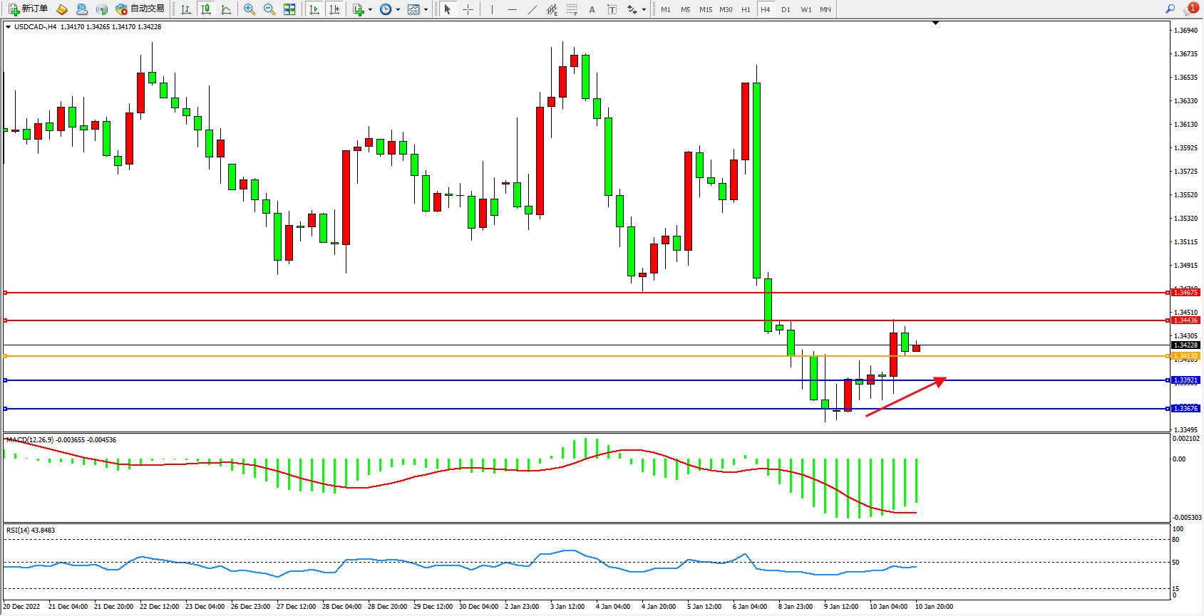美元加元USDCAD——4小时K线图显示: