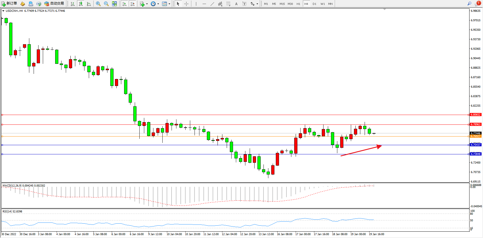 交易策略:6.76927上方看涨,目标6.78963、6.80652