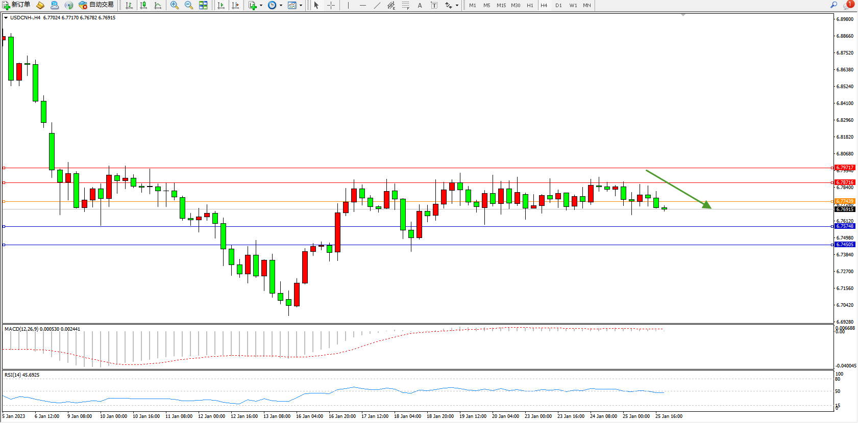 交易策略:6.77439下方看跌,目标6.75748、6.74505