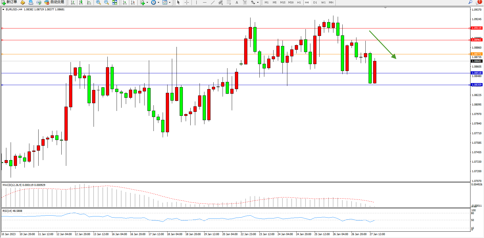 欧元美元EURUSD—4小时K线图显示: