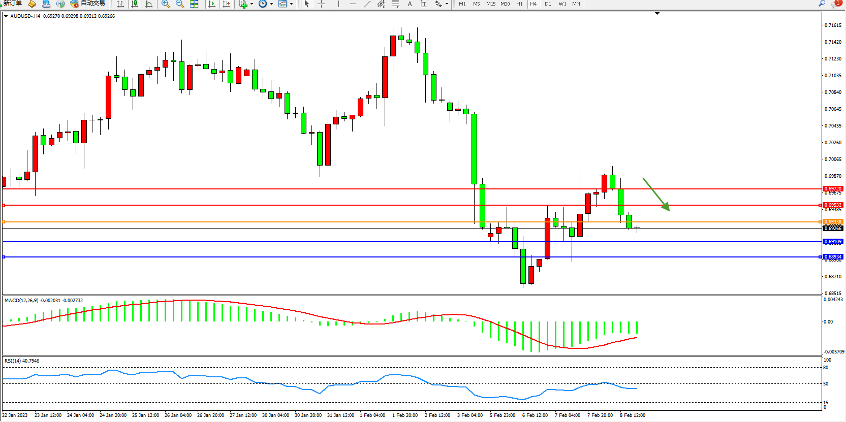 交易策略:0.69338下方看跌,目标0.69109、0.68934