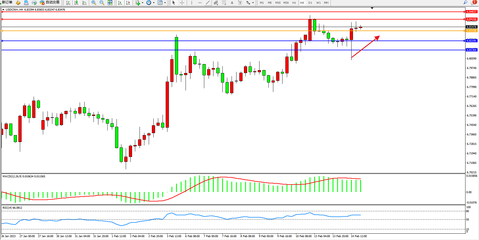 美元人民币USDCNH——4小时K线图显示: