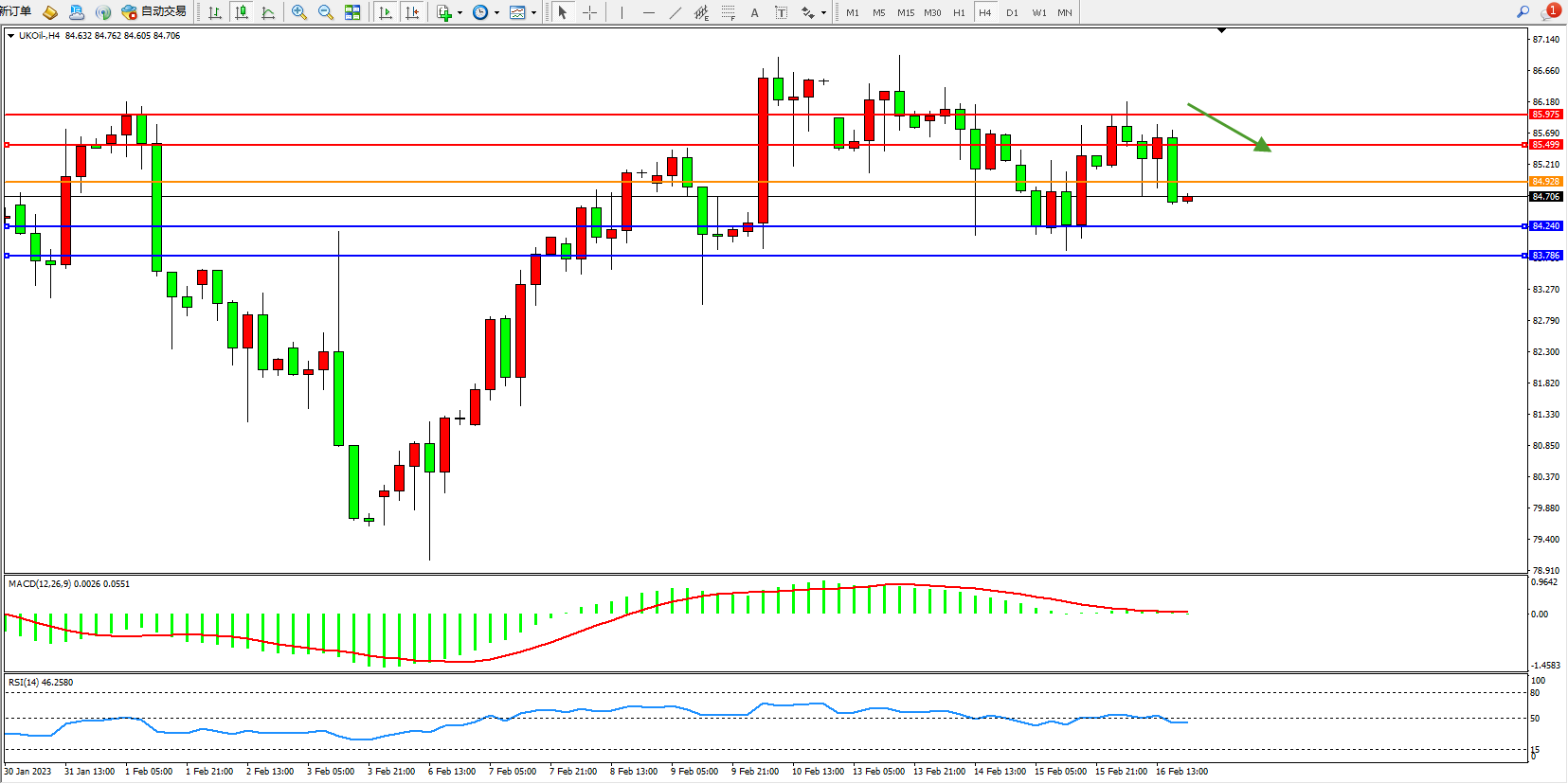 交易策略:84.928下方看跌,目标84.240、83.786