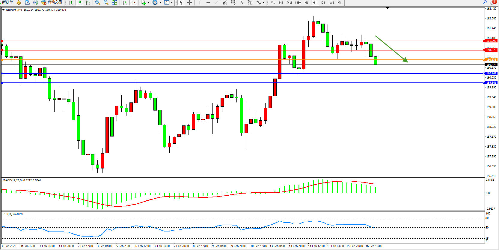 备选策略:160.638上方看涨,目标160.970、161.290