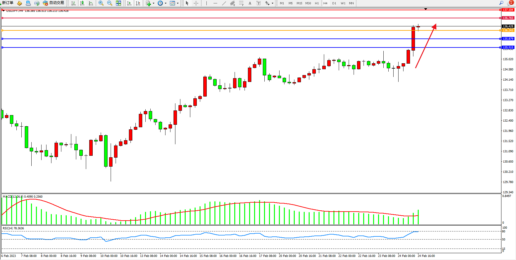 4小时图看:高位多头强势拉升,短期看涨情绪涌现,市场多头不断上扬,MACD指标处于多头区域持续上移,RSI指标处于多头区域持续上移至超买区80均衡线附近徘徊;