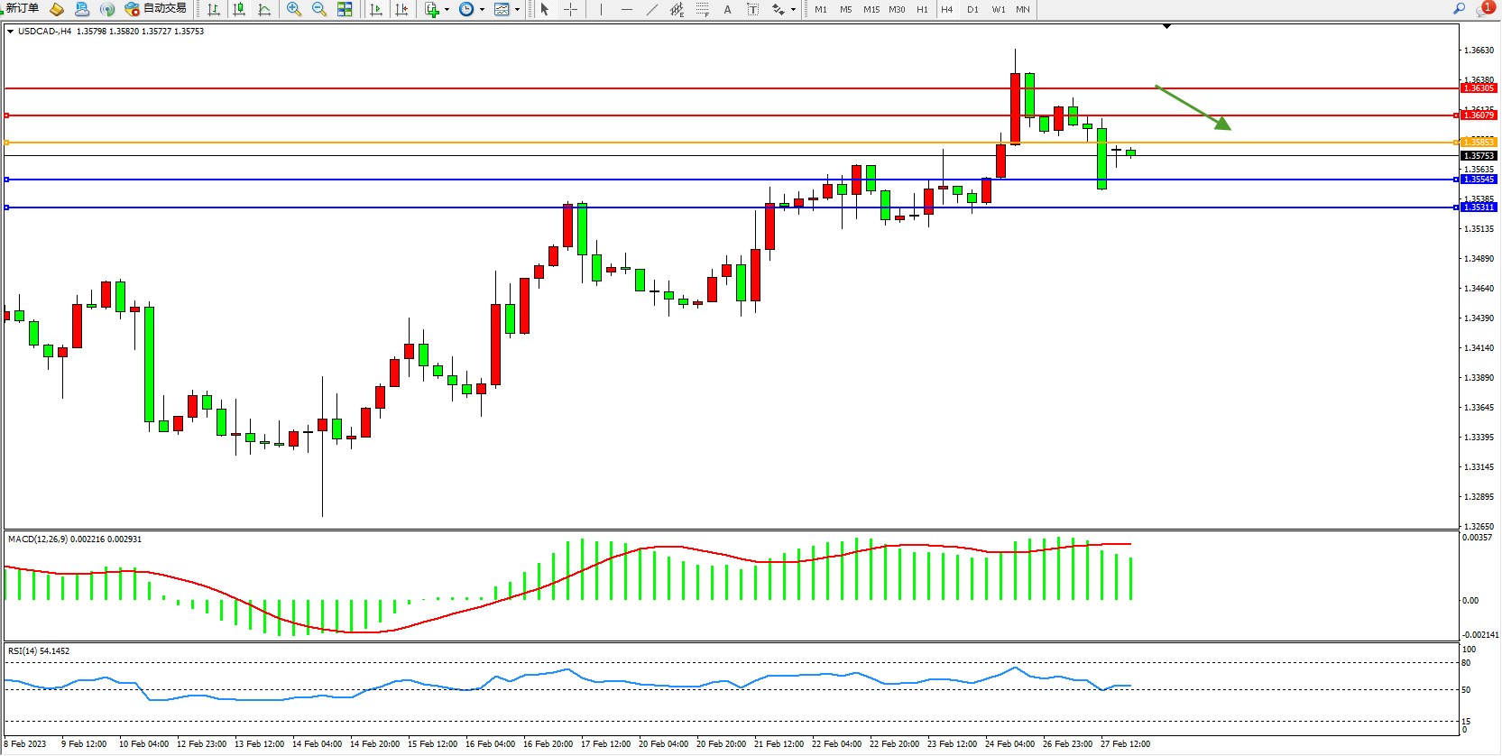 美元加元USDCAD——4小时K线图显示: