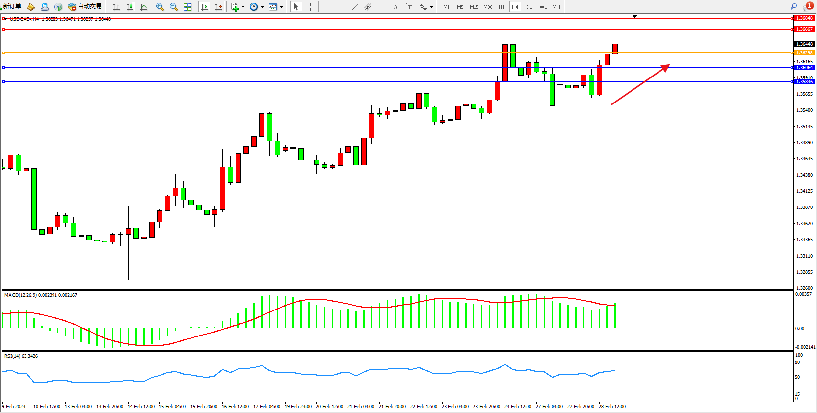 美元加元USDCAD——4小时K线图显示: