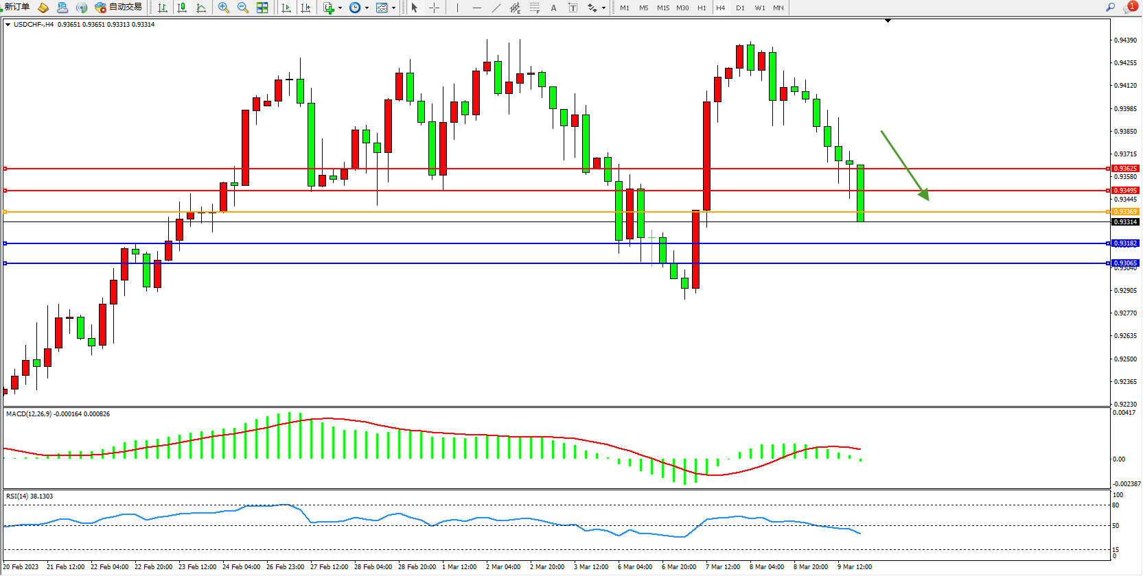 交易策略:0.93369下方看跌,目标0.93182 0.93065