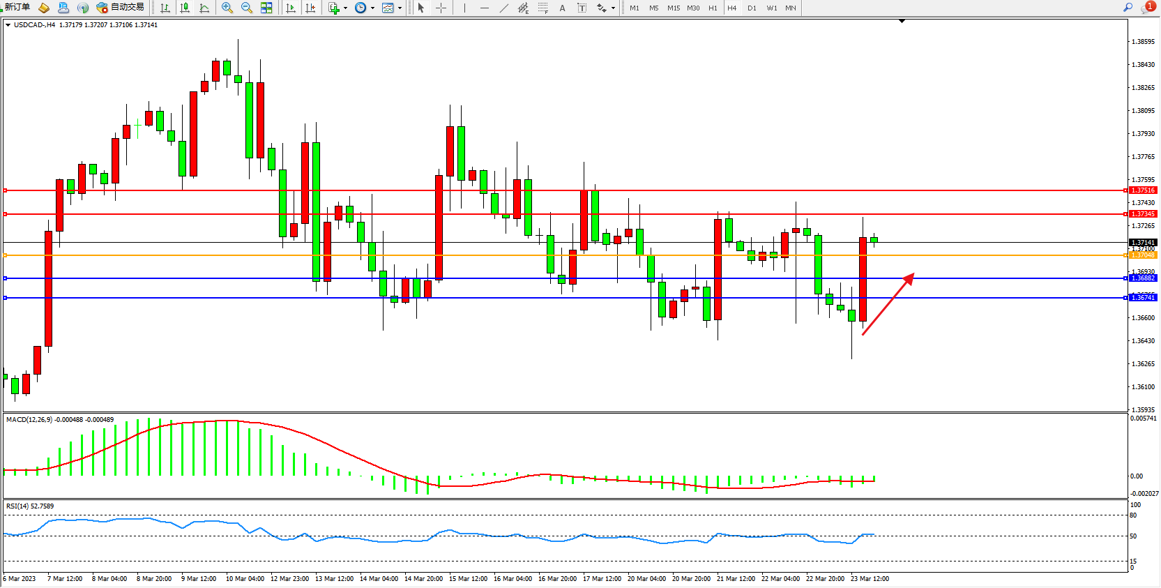 美元加元USDCAD——4小时K线图显示: