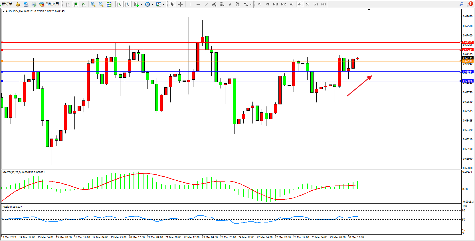 交易策略:0.67104上方看涨,目标0.67234  0.67319