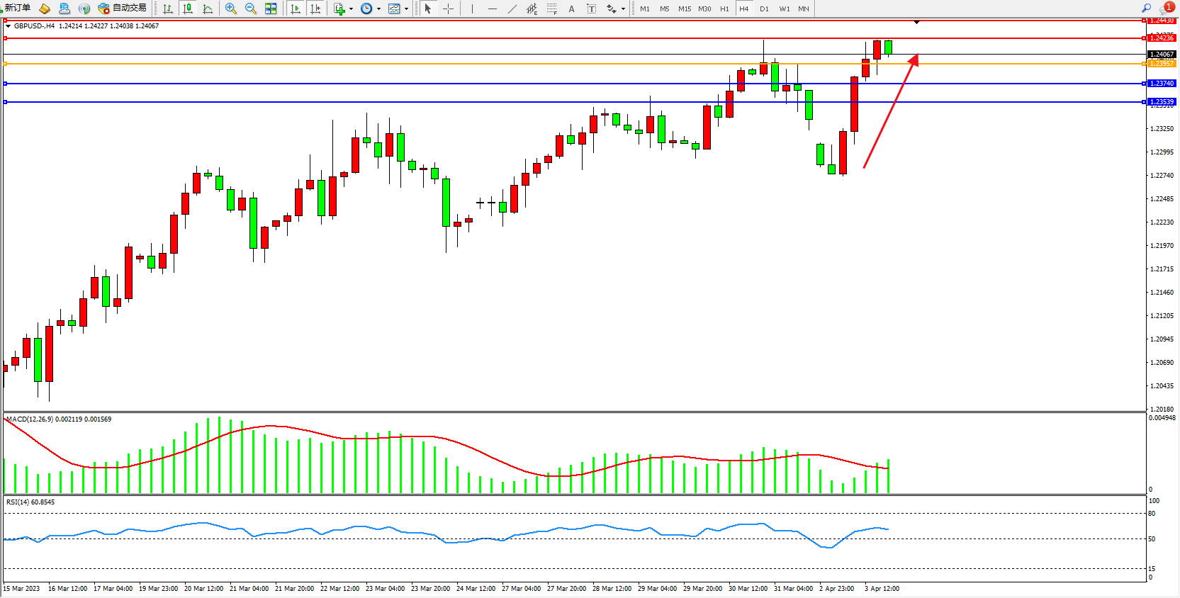 4小时图看:高位多头动力强势拉升,市场看涨情绪笼罩,短期多头动力有继续拉升态势,MACD指标处于多头区域持续上移,RSI指标处于50均衡线上側震荡;