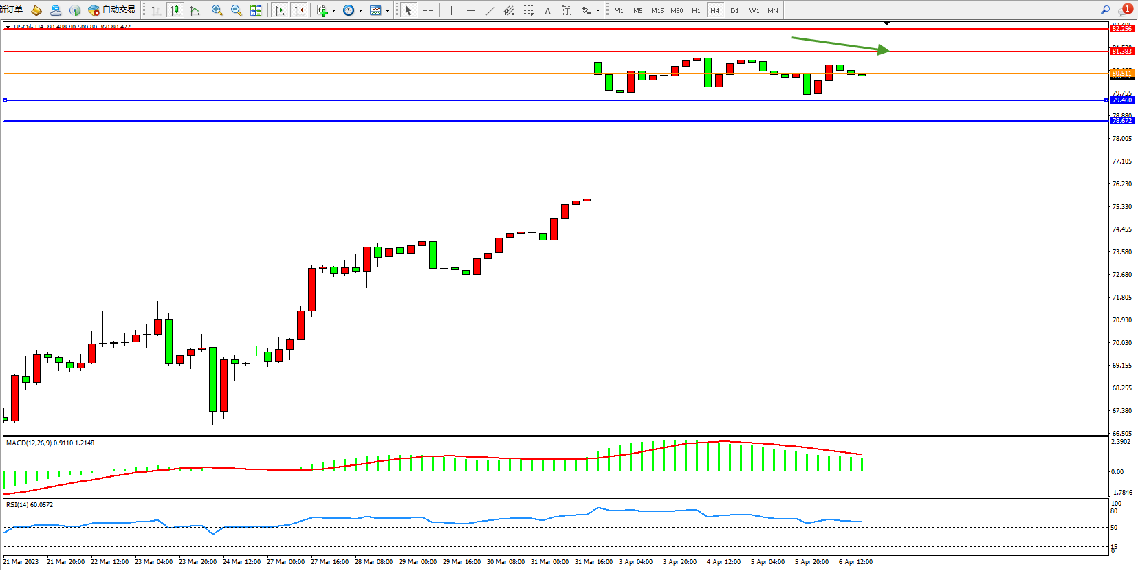 原油USOil——4小时K线图显示: