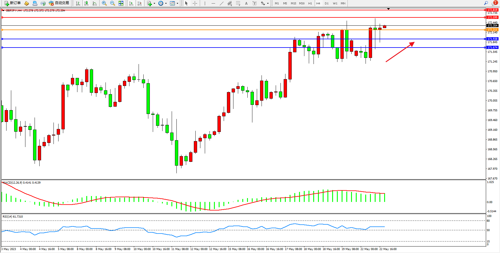 交易策略:172.211上方看涨,目标172.599 173.819