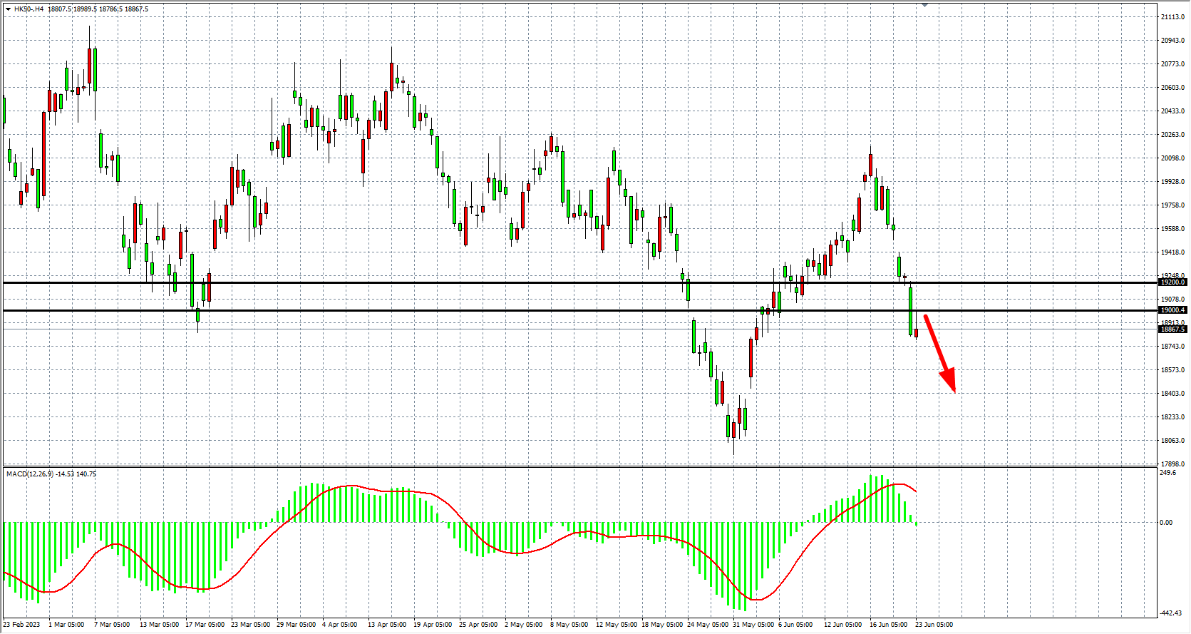 4小时图看,恒指进一步下破19000点,MACD量能下穿零轴,趋势延续空头,阻力关注19000-19200,下方目标看18500-18200。