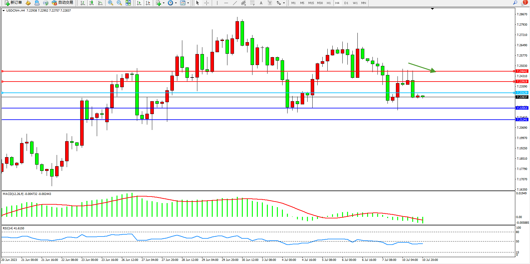 交易策略:7.23129下方看跌,目标7.22053 7.21241