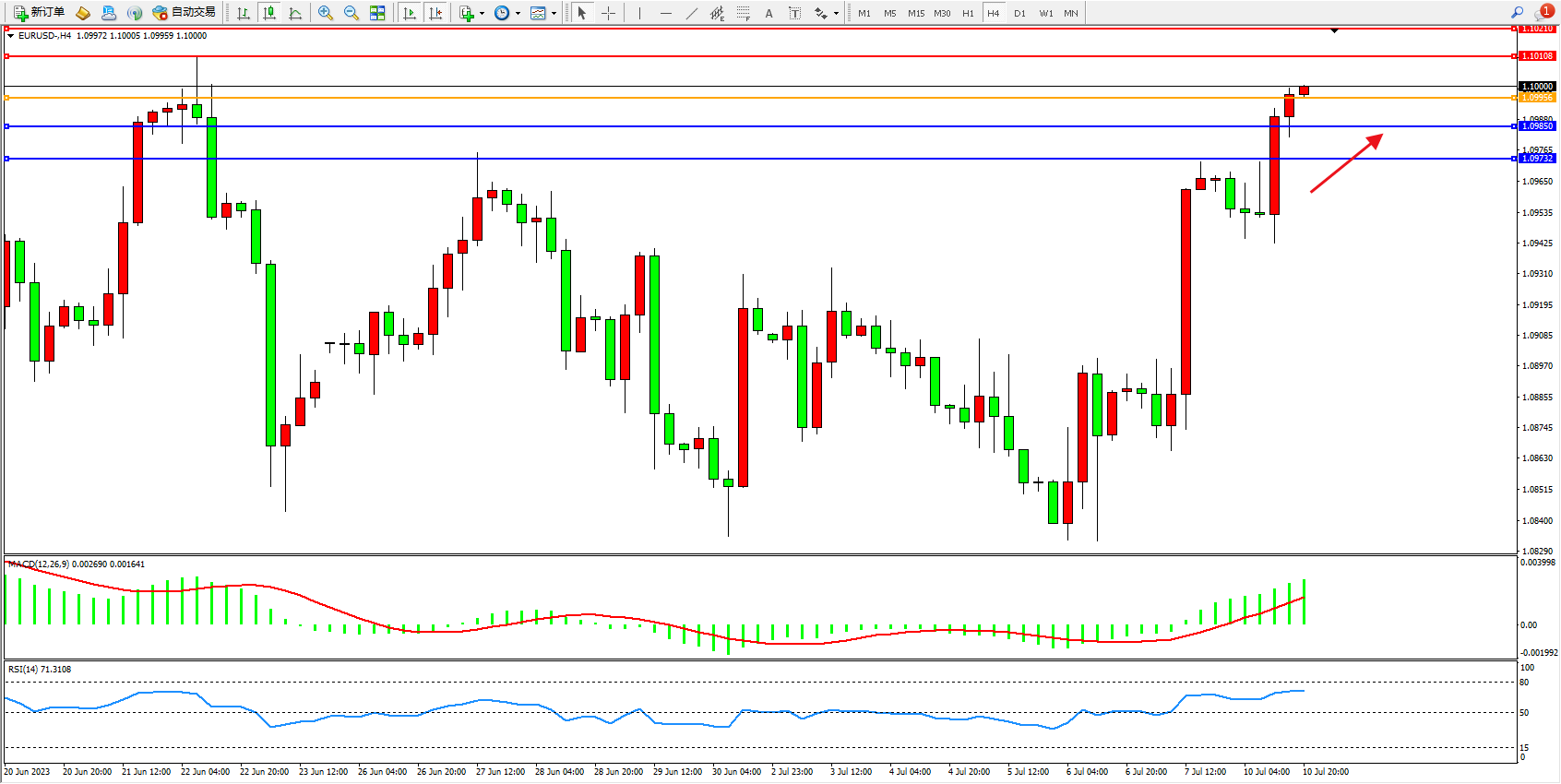 4小时图看:高位多头动力持续震荡上扬,短期看涨情绪持续,市场多头不断攀升中,MACD指标处于多头区域持续上行,RSI指标处于多头区域高位震荡;