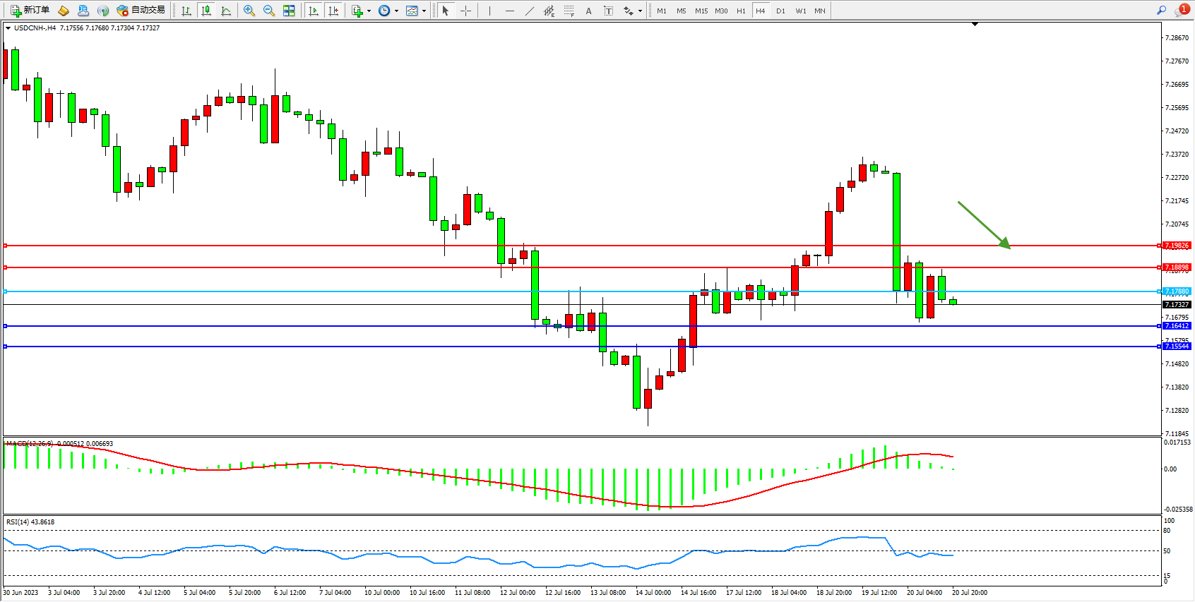 交易策略:7.17880下方看跌,目标7.16412 7.15544