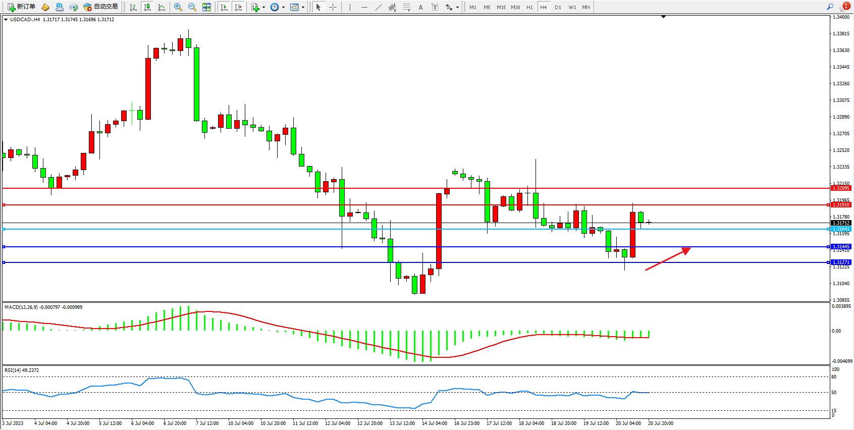 美元加元USDCAD——4小时K线图显示: