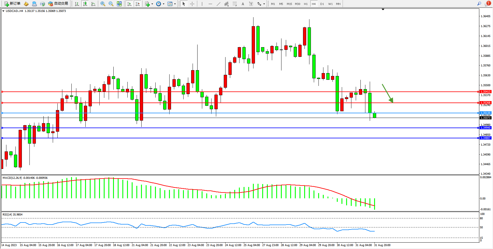 美元加元USDCAD——4小时K线图显示: