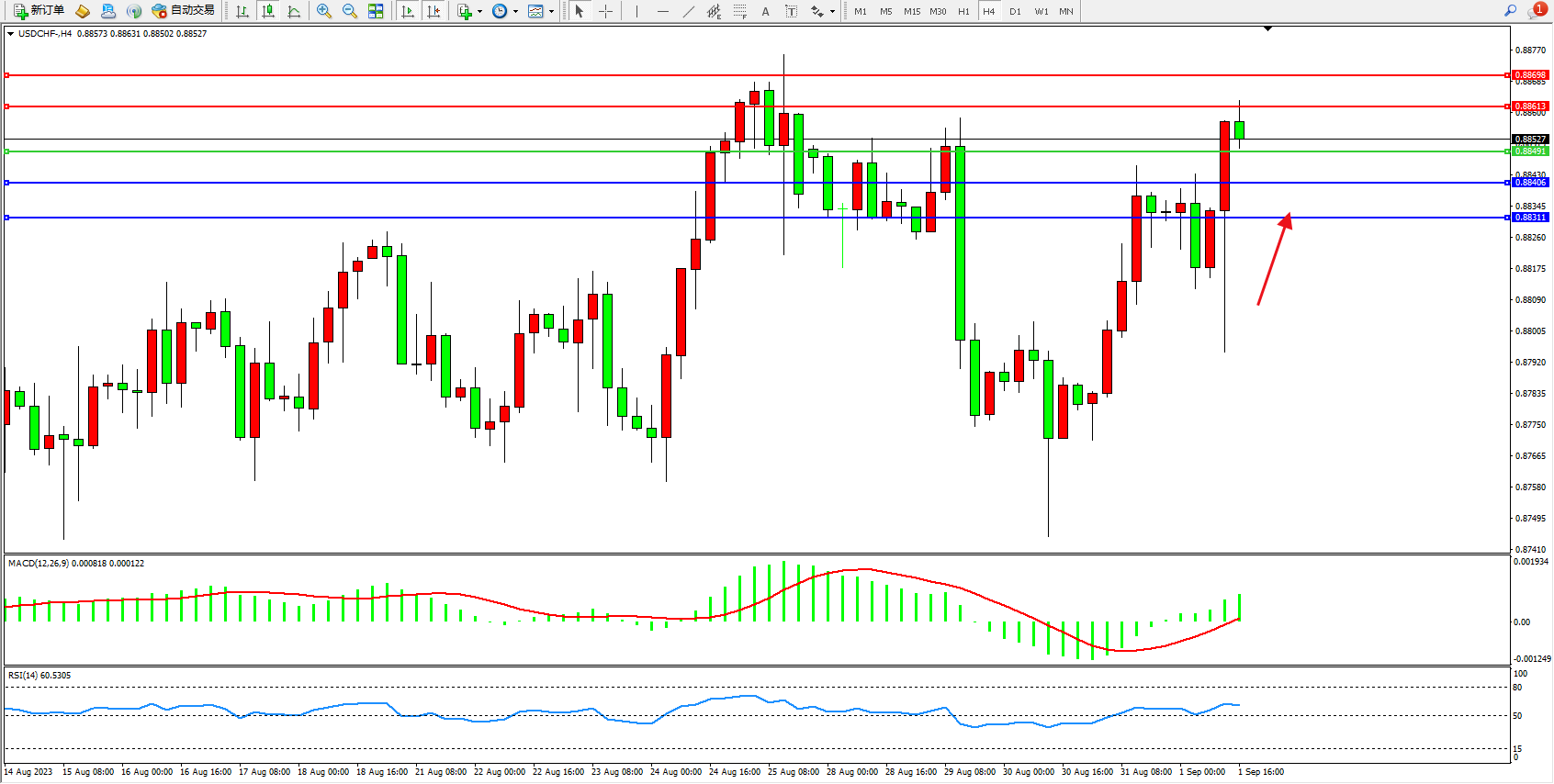 交易策略:0.88491上方看涨,目标0.88613 0.88698