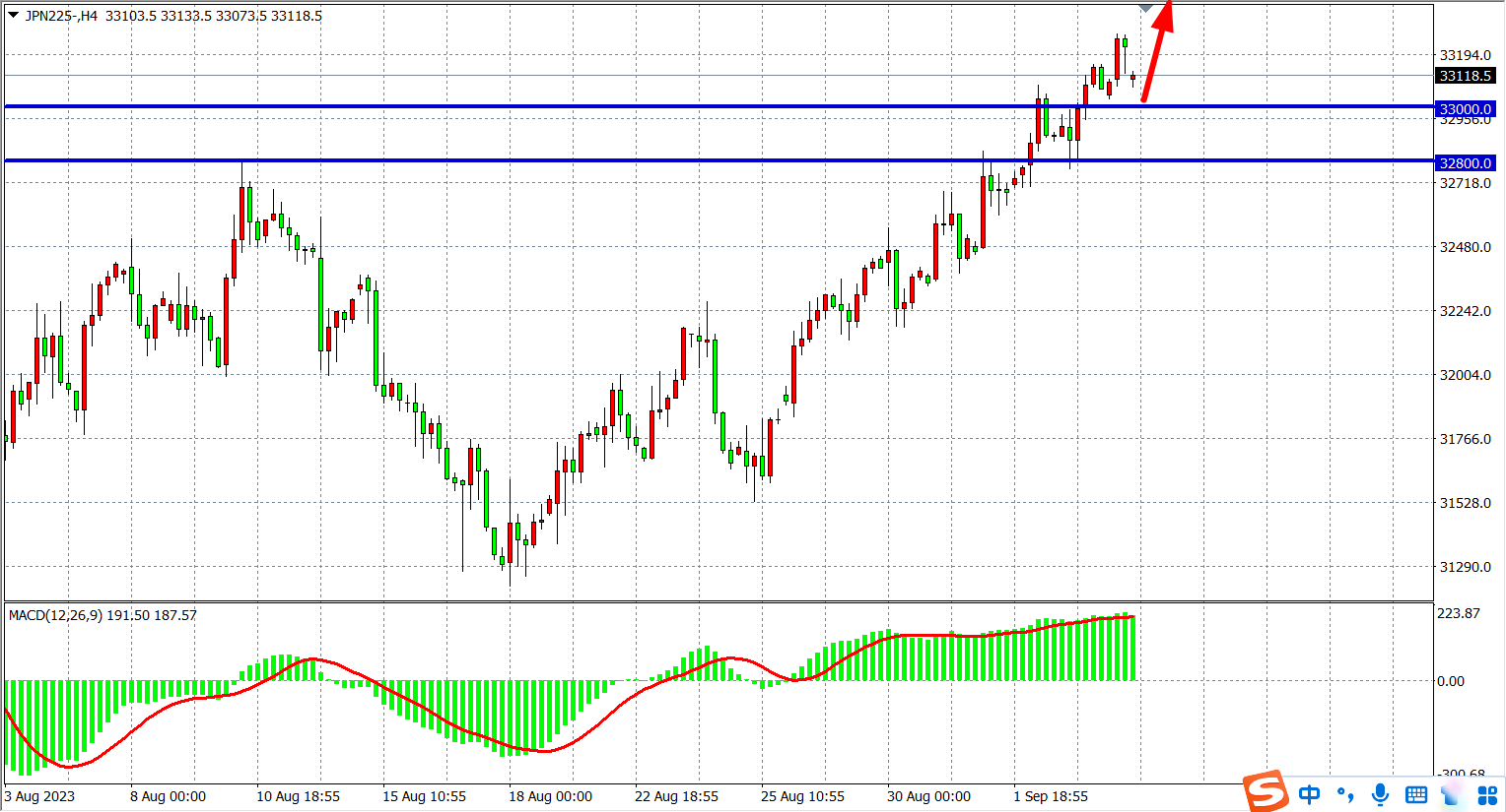 4小时图看,日经指数继续在33000之上运行,MACD量能在零轴上维持放量,支撑关注33000附近,阻力上看33300-33500附近。