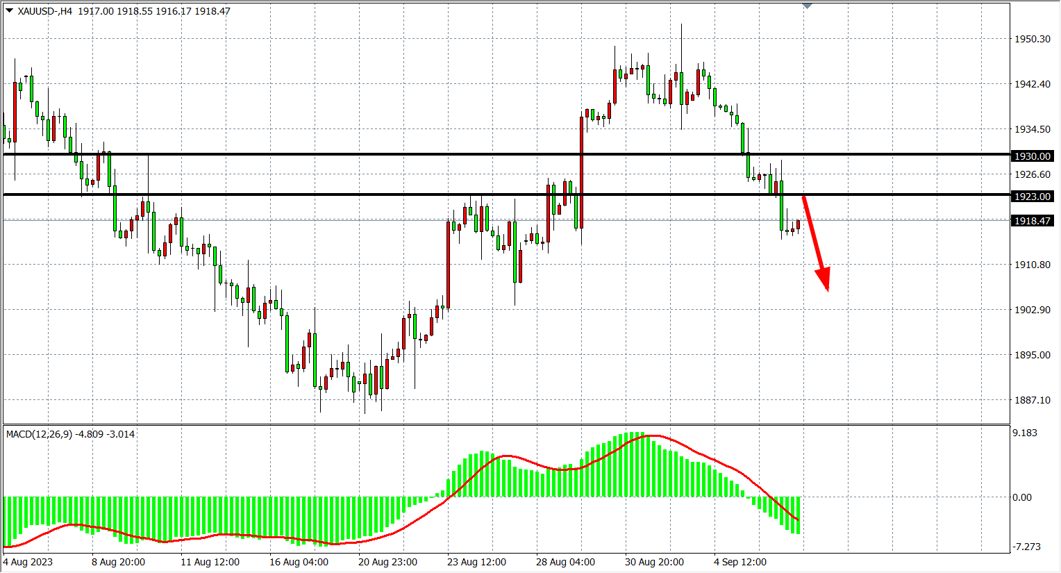 4小时图看,黄金进一步下跌至1915附近,行情延续跌势,阻力关注1923-1930,支撑关注下方1905-1895附近。