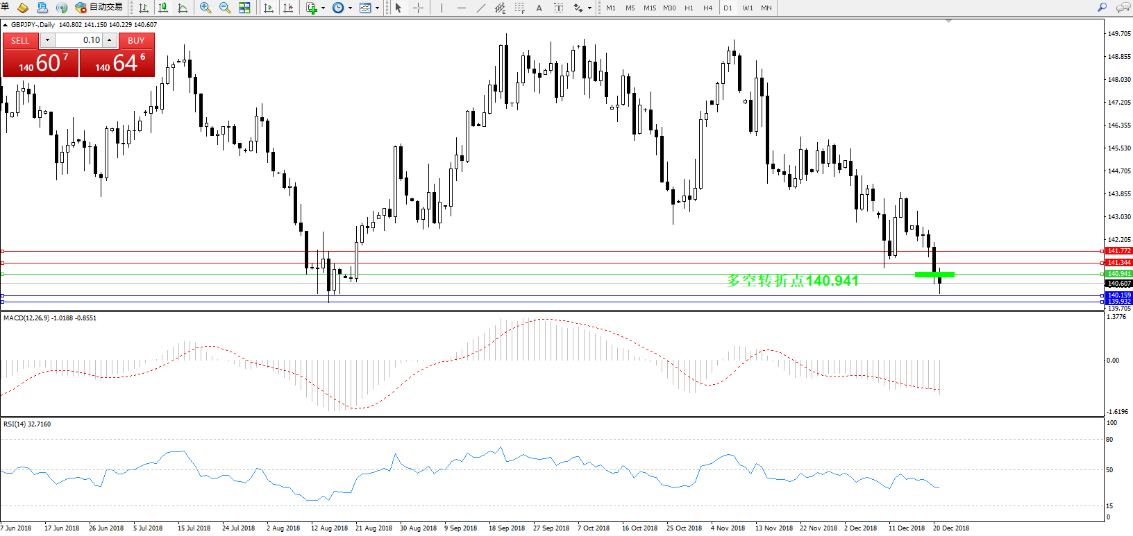 交易策略:140.941下方看跌,目标140.159、139.932