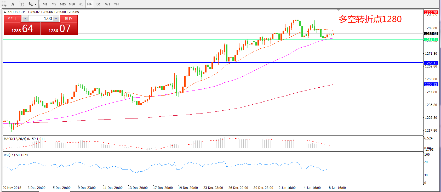 交易策略:在1280.00之上看涨,目标1300.00  1319.00