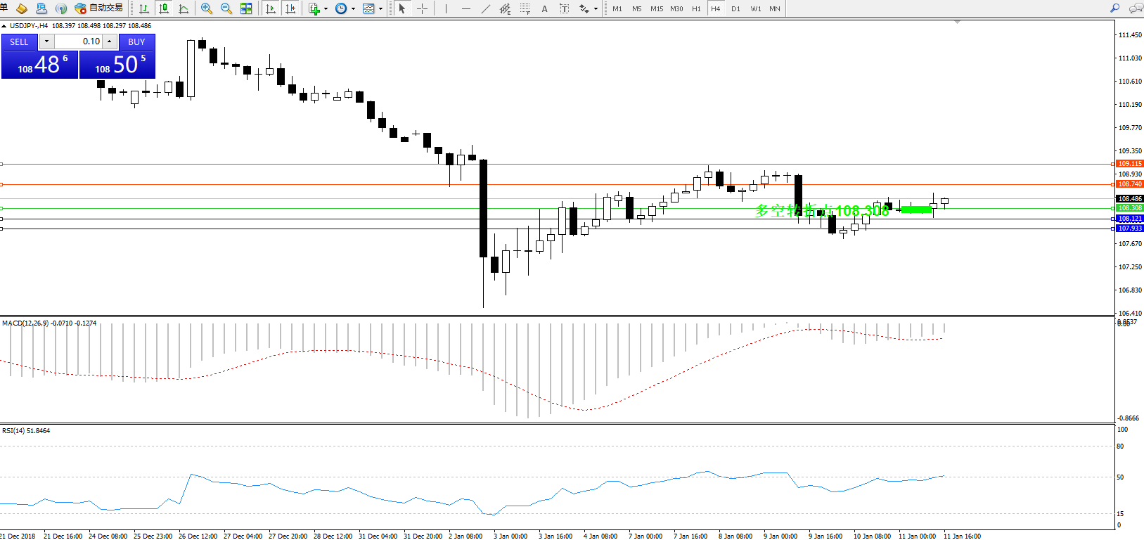 交易策略:108.308上方看涨,目标108.740109.115