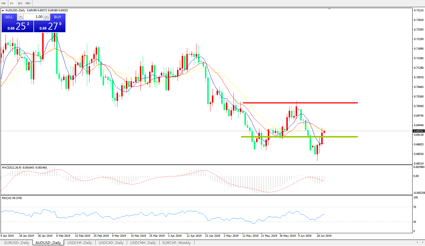 技术面简析:日图均线有序空头排列,但价格昨日反弹较为强劲,MACD在0轴下方运行且动能柱缩量,RSI逐步反弹走高,汇价在贸易战及美联储货币政策影响下反弹,但中期依旧考虑逢高做空。