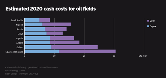 海湾合作委员会(GCC)的小伙伴还是认沙特这个老大的,但是非洲的欧佩克成员国兄弟就只能苦加哭。路透的报道显示,俄罗斯目前的财政预算平衡油价40+,沙特的在80+,像利比亚、阿尔及利亚、尼日利亚都在100以上的水平!沙特的现金流成本最低,10美元不到;俄罗斯的也不高,15美元不到;其他非洲兄弟的要15-30美元/桶。像尼日利亚最近的原油都Brent现货价格减贴水,而Brent现货(DTD Brent)也就20出头,所以尼日利亚的原油几乎就赔本边缘了。加蓬、赤道几内亚的原油现货卖得就完全是赔钱了。而对于像加蓬、尼日利亚这样的国家,这次呼吁欧佩克讨论市场,几乎就没一丝的影响力,被沙特无情的回绝了。一位尼日利亚的石油业内人士告诉路透记者,能做的就是问问而已,毫无能力。面对低油价和疫情,对于依赖石油收入的非洲产油国而言,今年是个异常痛苦的年份!对于沙特而言,毫不留情的价格战需要换取的如果仅仅是市场份额,那将是彻头彻尾的失败!不过沙特仍然再疯狂中,最近的豪言是要在5月份出口原油1060万桶/日。