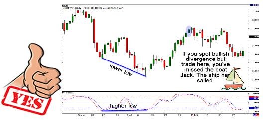 如果你描绘出了背离形态,但是价格走势此时却已经出现转向,并朝着逆转后的方向运行了一旦时间,那么,这次你已经错过了背离交易的时机。你所能够做的全部只是等待另一次区间高点/低点的形成,并再次开始你寻找背离之旅。